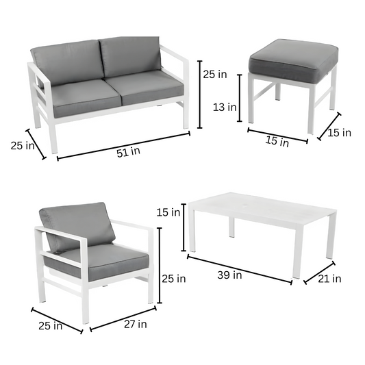 White Kaia Sofa Set with Grey Cushion - 6 Seater Sofa Set with Table and 2 Ottoman Stool